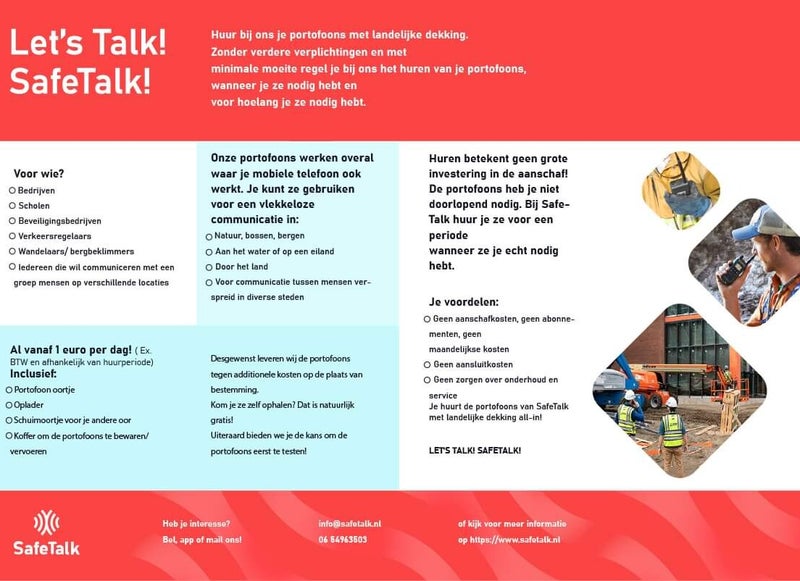 Je kunt onze SafeTalk smart portofoons huren. Wij hebben lang nagedacht over een simpel en duidelijk concept om het huren van jouw SafeTalk portofoon eenvoudig, simpel en overzichtelijk te maken. Laten we eerlijk zijn, heb jij zin in een papierwinkel en lange gesprekken ? Het moet gewoon werken!